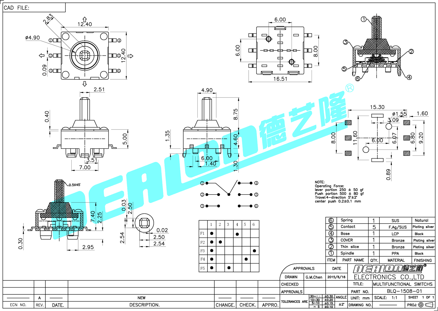 多功能開關(guān),型號(hào)BLQ-1508-01,尺寸:12.4mm*12.4mm,由德藝隆精密工業(yè)股份有限公司研發(fā)生產(chǎn)。自主開發(fā)產(chǎn)品包括多功能開關(guān)、輕觸開關(guān)、檢測(cè)開關(guān)、滑動(dòng)開關(guān)、帶燈輕觸開關(guān)、按鍵開關(guān)、微動(dòng)開關(guān)、耳機(jī)插座、DC插座等。